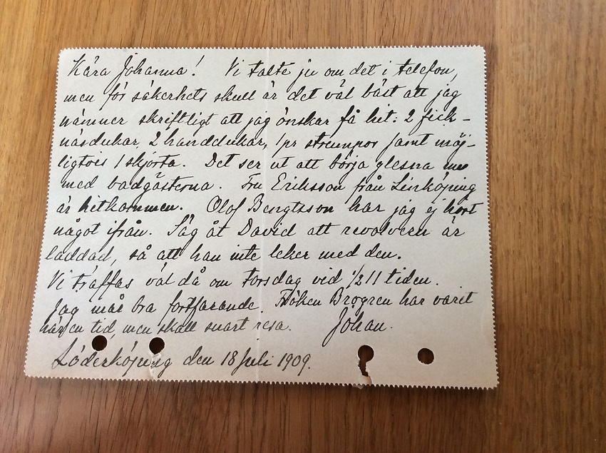 Brevet är från Johan till sin fru Johanna när han var på Söderköpings brunn. David som nämns i brevet är Olles morfar då 14 år. Senare gift med mormor Greta. Detta och liknande brev finns bevarade i stugan för dig som önskar läsa.